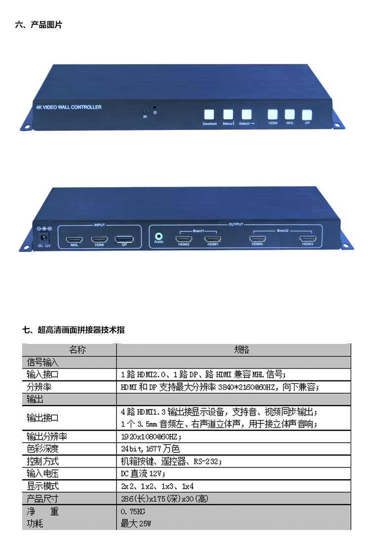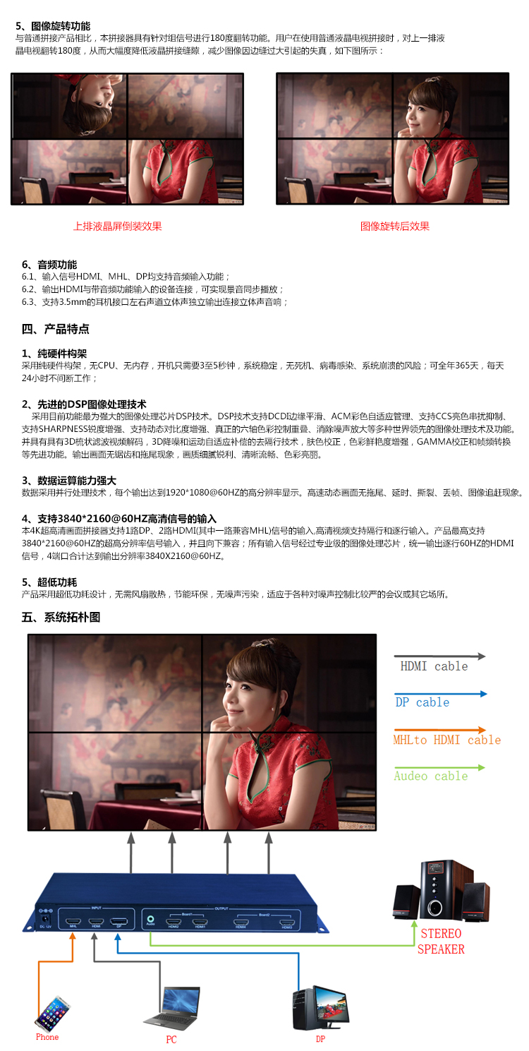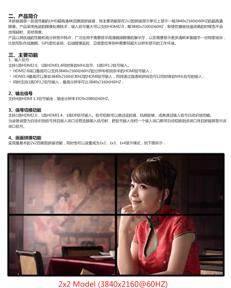 本產品是定制化的4K畫面拼接器,其主要功能是在M x N的拼接顯示單元上顯示一幅3840x2160@60HZ的超高清4K圖像。產品采用先進的圖像處理技術,輸入信號最大可以支持HDMI2.0,即3840x2160@60HZ,即使在播放快速動畫的時候也不會出現(xiàn)延時、丟幀現(xiàn)像。