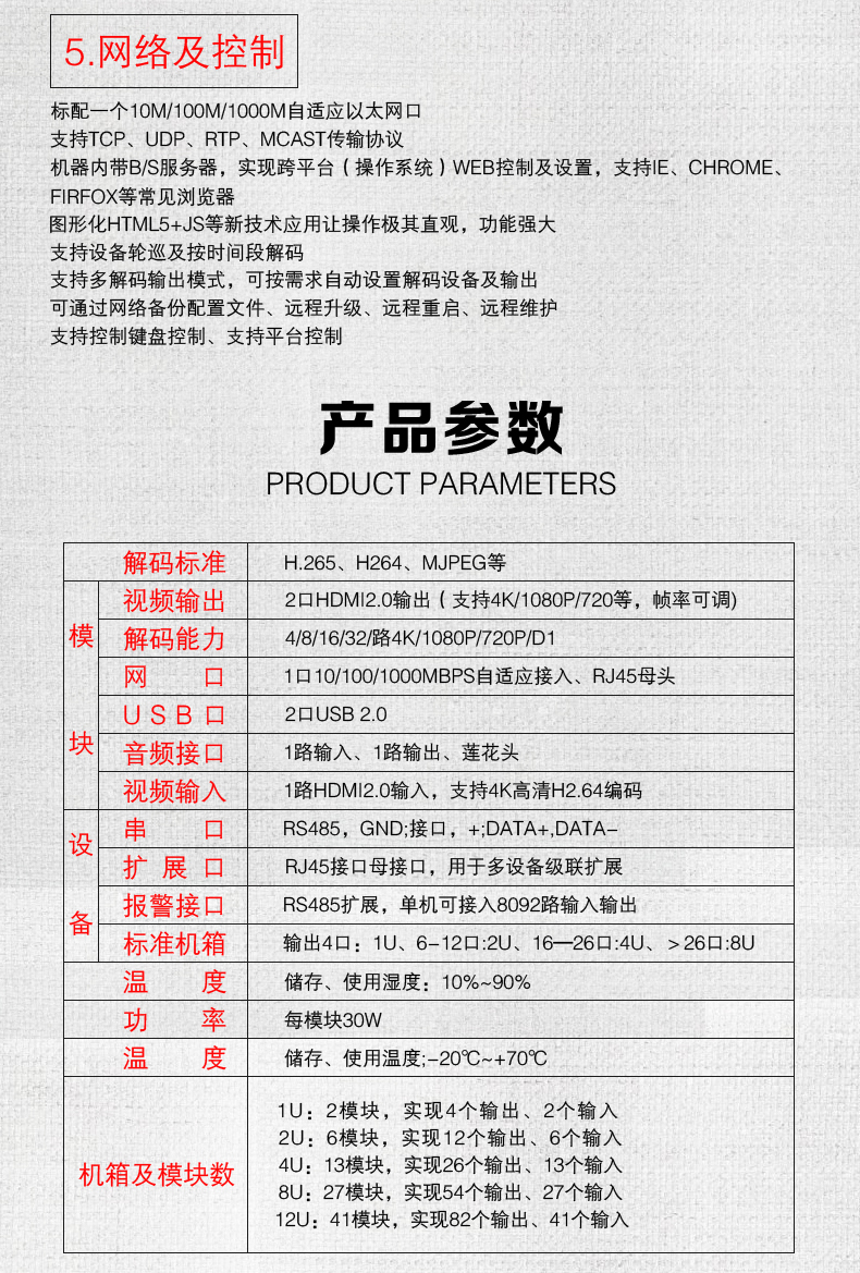 網(wǎng)絡數(shù)字解碼矩陣切換器采用最新的安防專用編解碼芯片,專為H.265標準及4K超高清編解碼而設計,產(chǎn)品采用嵌入式LINUX架構,保障系統(tǒng)的穩(wěn)定運行,采用模塊化設計,可以在大型、超大型數(shù)字安防監(jiān)控系統(tǒng)中實現(xiàn)解碼、編碼、拼接、分割、畫中畫、漫游等功能,為工程項目最大程序解決大數(shù)據(jù)數(shù)字化監(jiān)控系統(tǒng)提供解碼上墻及多信號輸入編碼等提供一站式解決方案;設備采用全鋁標準機箱,結構上大氣美觀可靠,散熱性結構化好。
